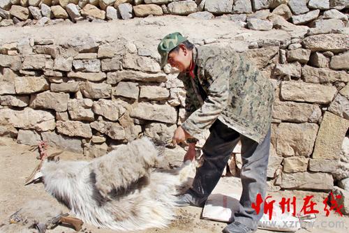 岢嵐縣西豹峪鄉(xiāng)謝家坪村農民王占財,通過十多年努力,成為當?shù)剡h近聞名的養(yǎng)羊大戶。目前,他共飼養(yǎng)了240 余只晉嵐絨山羊,在每年三、四月份的抓絨期,便可收入20000余元。圖為他在抓絨。(李俊武 攝)