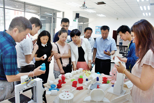 6 月1 日上午,市科技局對我市的兩個眾創(chuàng)空間進行掛牌。目前我市已建成7 家眾創(chuàng)空間,搭建了廣闊的平臺,鼓勵大學(xué)生創(chuàng)業(yè)。圖為市科技局和忻府區(qū)科技局的領(lǐng)導(dǎo)以及新聞媒體人員在大學(xué)生創(chuàng)業(yè)園區(qū)的眾創(chuàng)空間參觀3D打印。(楊峻峰 攝)