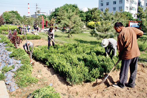 5 月29 日,在原平市永康南路的119 消防文化主題公園,園林工人正在為公園添綠。該市開展生態(tài)城市建設(shè)以來,數(shù)十個城中村與城邊村公園綠地面積有了大幅提升,有效改善了居民的生活環(huán)境。(褚震 攝)