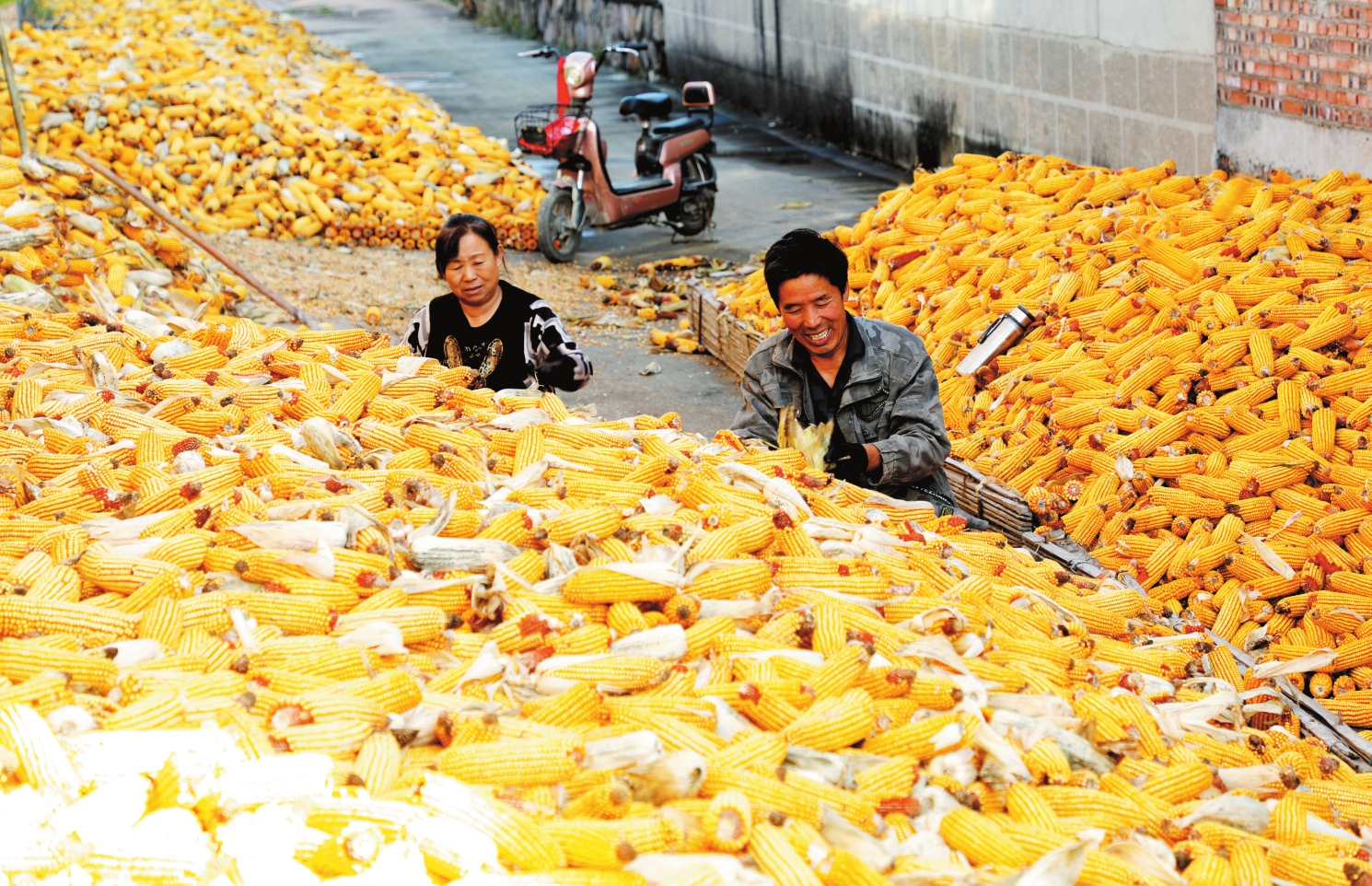 近日,原平市新原街道桃園村村民緊抓晴好天氣晾曬玉米,農(nóng)家場院呈現(xiàn)出一派喜人的豐收景象。(