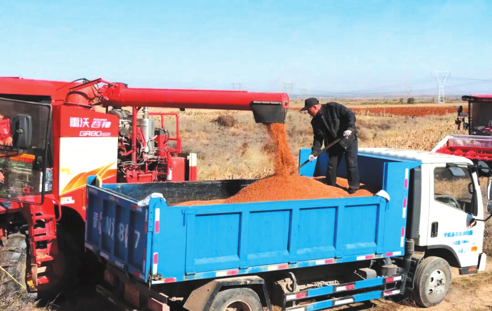 深秋時節(jié),涼意漸濃。寧武縣薛家洼鄉(xiāng)高崖上村的田野間一片金黃,村民們忙碌的身影點綴其間,呈現(xiàn)出一派繁忙的豐收景象。數(shù)臺大型聯(lián)合收割機開足馬力,高效完成切割、脫粒、秸稈粉碎等作業(yè)。