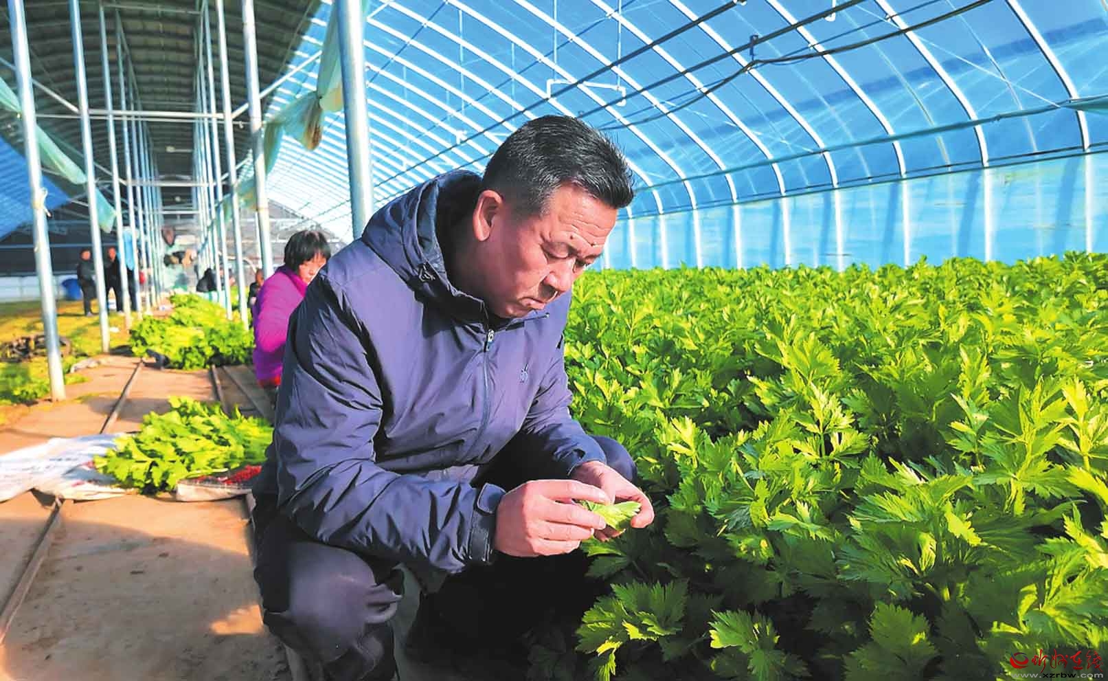近日,忻府區(qū)農業(yè)農村局組織農技專家團隊深入忻口鎮(zhèn)高標準蔬菜育苗基地,開展越冬作物防寒防凍技術指導。圖為農技專家查看芹菜生長狀態(tài)。(趙曼君攝)