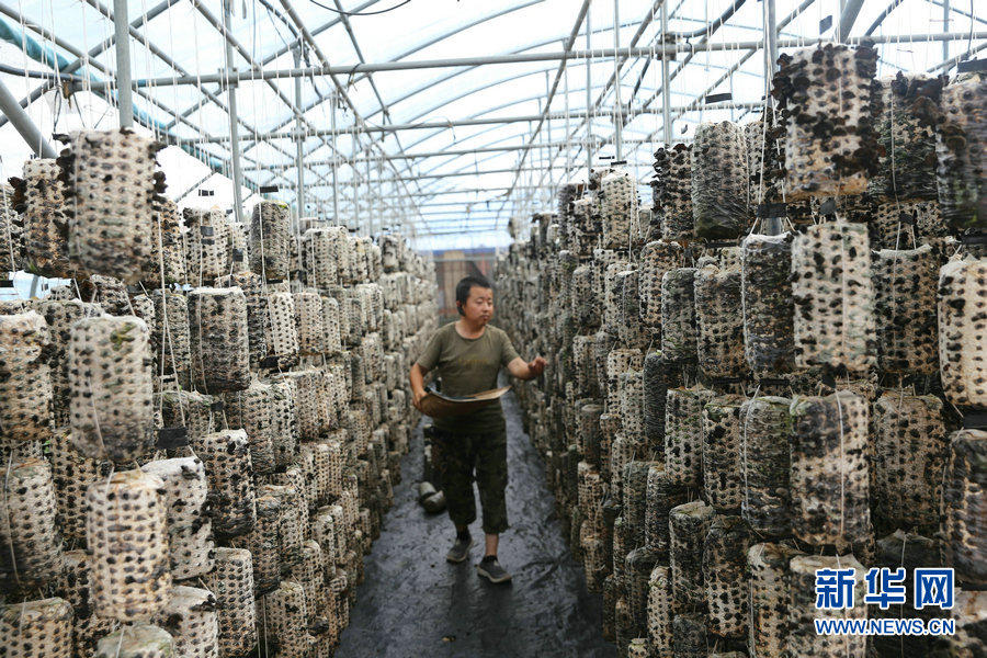 8月6日,劉振義在大棚里查看木耳生長(zhǎng)情況。新華網(wǎng)曹楨攝