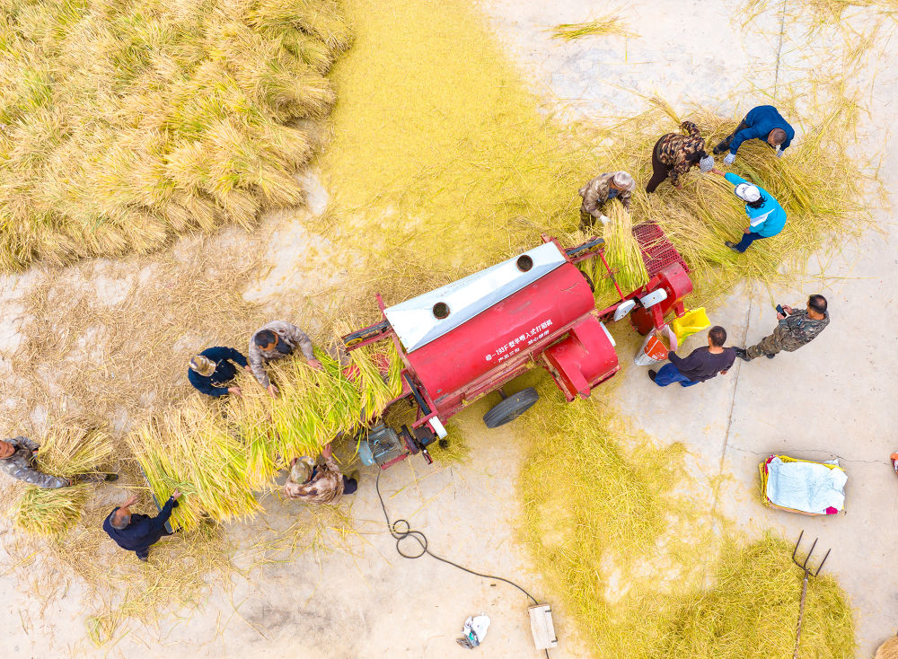 田間地頭,一派繁忙景象。大型收割機(jī)在成片的稻浪中轟鳴穿梭,高效完成收割、脫粒等工序;對(duì)于部分因大風(fēng)倒伏的水稻,村民們則彎腰進(jìn)行人工搶收。與此同時(shí),打谷、裝袋、運(yùn)輸……各項(xiàng)工序有條不紊,機(jī)械與人力緊密配合,勾勒出一幅生動(dòng)的秋收畫卷。