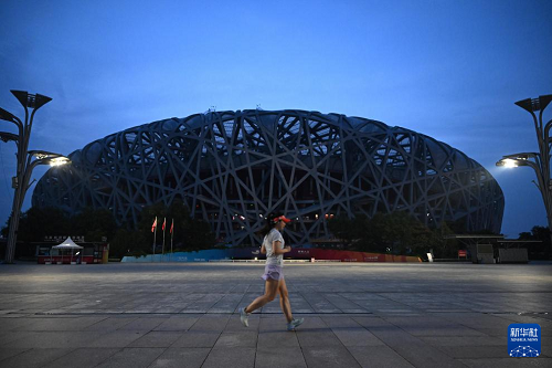 9月3日清晨,市民在鳥巢前晨跑。(新華社記者 陳浩明 攝)