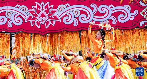 9月15日,演員在開幕式上表演以糌粑為主題的女子群舞。(新華社記者 黨黎 攝)