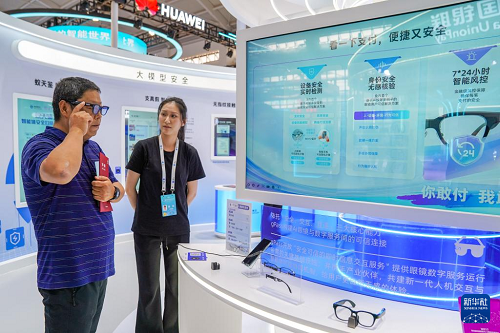 9月15日,觀眾在云南昆明舉行的2025年國家網(wǎng)絡(luò)安全宣傳周配套活動——網(wǎng)絡(luò)安全博覽會暨網(wǎng)絡(luò)安全產(chǎn)品和服務(wù)國際推介會上體驗智能眼鏡。(新華社記者 彭奕凱 攝)