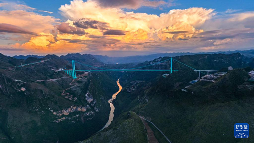 9月28日拍攝的夕陽下的貴州花江峽谷大橋(無人機(jī)照片)。(新華社記者 楊文斌 攝)