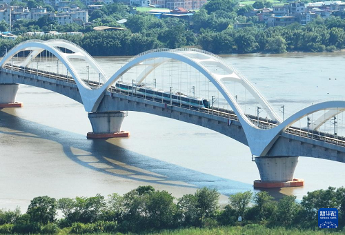 9月29日,列車駛?cè)霝I??炀€帝封江站(無(wú)人機(jī)照片)。(新華社記者 林善傳 攝)