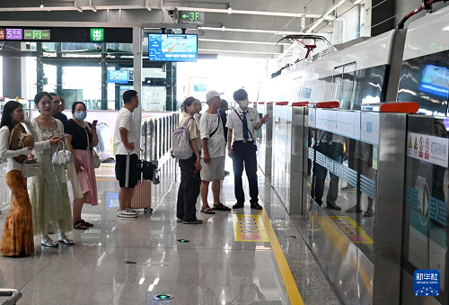9月29日,人們?cè)跒I??炀€帝封江站等候前往福州長(zhǎng)樂(lè)國(guó)際機(jī)場(chǎng)的列車。(新華社記者 林善傳 攝)