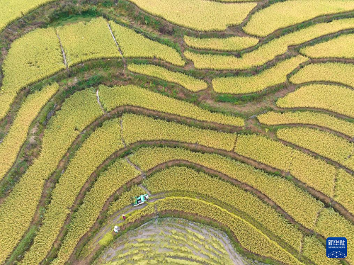 10月10日,湖北省宜昌市秭歸縣沙鎮(zhèn)溪鎮(zhèn)長春村村民駕駛農(nóng)機在田間收獲水稻。(新華社發(fā) 王罡 攝)
