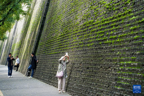 西安城墻始建于隋唐、擴建于明代,是中國現(xiàn)存歷史最悠久、保存最完整的古代城垣建筑。連綿秋雨過后,苔蘚等植物為西安城墻披上了一層綠色的外衣,吸引市民和游人駐足觀看、拍照。