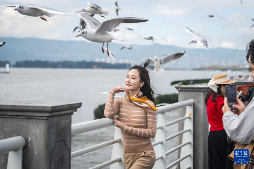 11月10日,游客在云南省昆明市海埂大壩觀光留影。(新華社記者 王冠森 攝)