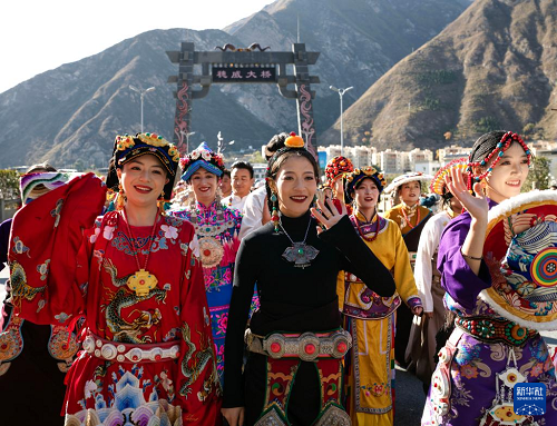 11月19日,在四川省汶川縣城,身著民族服飾的婦女參加非遺大巡游活動(dòng)。(新華社發(fā) 蘭紅光 攝)