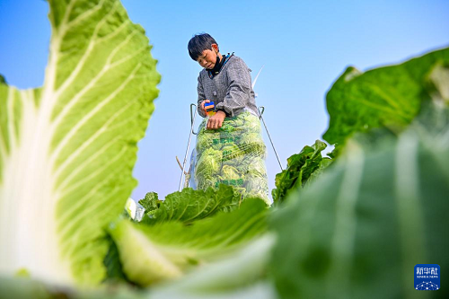 1月5日,河南省商丘市夏邑縣會亭鎮(zhèn)西街東村農(nóng)民在收獲大白菜。(新華社發(fā) 王高超 攝)