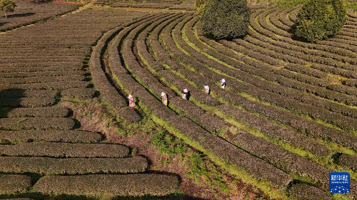 1月5日,茶農(nóng)在云南省普洱市寧洱哈尼族彝族自治縣寧洱鎮(zhèn)般海村管護茶園(無人機照片)。(新華社發(fā) 楊廷榮 攝)