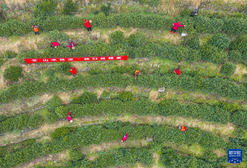 1月29日,湖北省秭歸縣郭家壩鎮(zhèn)王家?guī)X村茶農(nóng)在“絲綿茶1號(hào)”茶園采摘茶葉嫩芽(無(wú)人機(jī)照片)。(新華社發(fā) 王罡 攝)