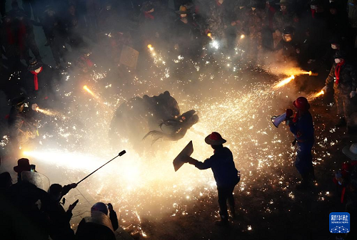 3月2日,在陜西旬陽市蜀河鎮(zhèn)蜀河社區(qū),表演人員在用煙花“燒獅子”。(新華社記者 邵瑞 攝)