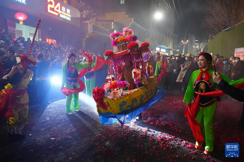 3月2日,在陜西旬陽市蜀河鎮(zhèn)蜀河社區(qū),表演人員在“燒獅子”間歇時表演劃彩蓮船。(新華社記者 邵瑞 攝)