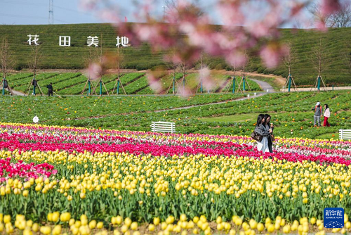 花田美地景區(qū)是浙江省金華市武義縣王宅鎮(zhèn)的特色鄉(xiāng)村旅游項目。近日,景區(qū)花海進入盛花期,金黃色的油菜花與粉色櫻花、多彩郁金香等共同構成春日美麗畫卷,吸引游客前來打卡游玩。