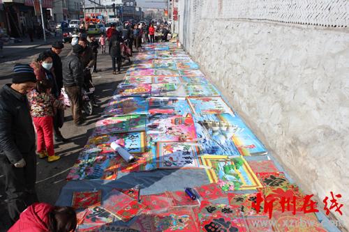 2月1日,在原平市新原鄉(xiāng)解放街村的農(nóng)貿(mào)市場(chǎng)上,村民們正在選購(gòu)年畫。過(guò)年了,不少農(nóng)村都在集市上選購(gòu)年畫、春聯(lián)、窗花、燈籠、掛件,準(zhǔn)備過(guò)個(gè)祥和喜慶的猴年春節(jié)。(曹申義 攝)