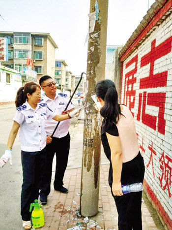 記者在利民西街看到,城管隊員手拿噴水器、小鏟子,對路邊電桿、墻壁、公交站牌等處的“小廣告”逐一認(rèn)真清理。不少“小廣告”由于粘貼得比較牢靠,隊員們用手撕扯后再沖洗,但被粘貼的位置依然留下了斑斑痕跡,再一次經(jīng)過重復(fù)操作,“小廣告”才被徹底清除。圖為工作人員正在清理“小廣告”(張志遠(yuǎn) 攝)