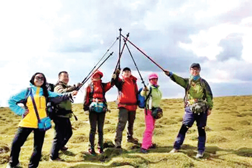 我們不曾相識,一點愛溫暖了人間。從東臺下來,一開始就不見了女兒,還好有閨蜜在身邊談天說地,偶爾“龍哥”擦身而過扔下一句笑話,轉(zhuǎn)眼就不見了蹤影;劉教授常跑國外,腿很長,頭戴禮帽,不用登山杖,腳步輕盈;“大師兄”人見人愛,他的腰間掛一個袋子,是用來裝路上撿到的水瓶、塑料袋、果皮等垃圾的,他身上的雨衣、登山杖好像是給大伙準(zhǔn)備的,誰需要就送給誰;郭大律師看見剛從山下上來,上氣不接下氣、氣喘不停的同行人,忙把自己的雨衣翻過來鋪在大石頭上讓人坐。“神腿”總是在隊伍的最后,落在后面的人,只要看見“神腿”就信心倍增,和“神腿”合張影,比出個“二”的手勢,仿佛自己也是“神腿”了。吳老師人很好,熱情地幫我拍了一張“打坐”的美照,真可謂不懂?dāng)z影的老師不是優(yōu)秀企業(yè)家;見到海濤群主不時從山上往山下跑,照顧落在后面的人;又遇見一位腰間掛垃圾袋的人,他走近一頭正在喂奶的母牛,像老朋友一樣輕輕地?fù)崦@牛的頭部,聽說他是講國學(xué)的馬老師。佛家講的是一種緣分,有緣自然來相會,我和馬老師聊著爬上了一個山頭,心頭一怔,馬老師不就是我們的學(xué)問大咖嗎?我們的八月大朝臺隊伍里藏龍臥虎,稍不留神,大咖就會從你身邊溜走。正說著,閨蜜劉老師從我身邊經(jīng)過,腰間掛著一袋子垃圾,直向前面一個易拉罐追去……