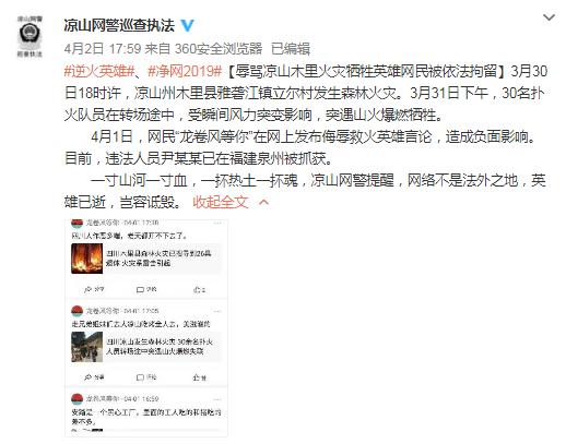 網(wǎng)民侮辱涼山救火犧牲英雄 警方通報(bào):已刑拘