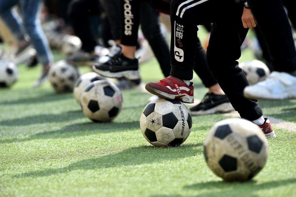↑這是學生們在球場上進行足球訓練(4月18日攝)。新華社記者詹彥攝