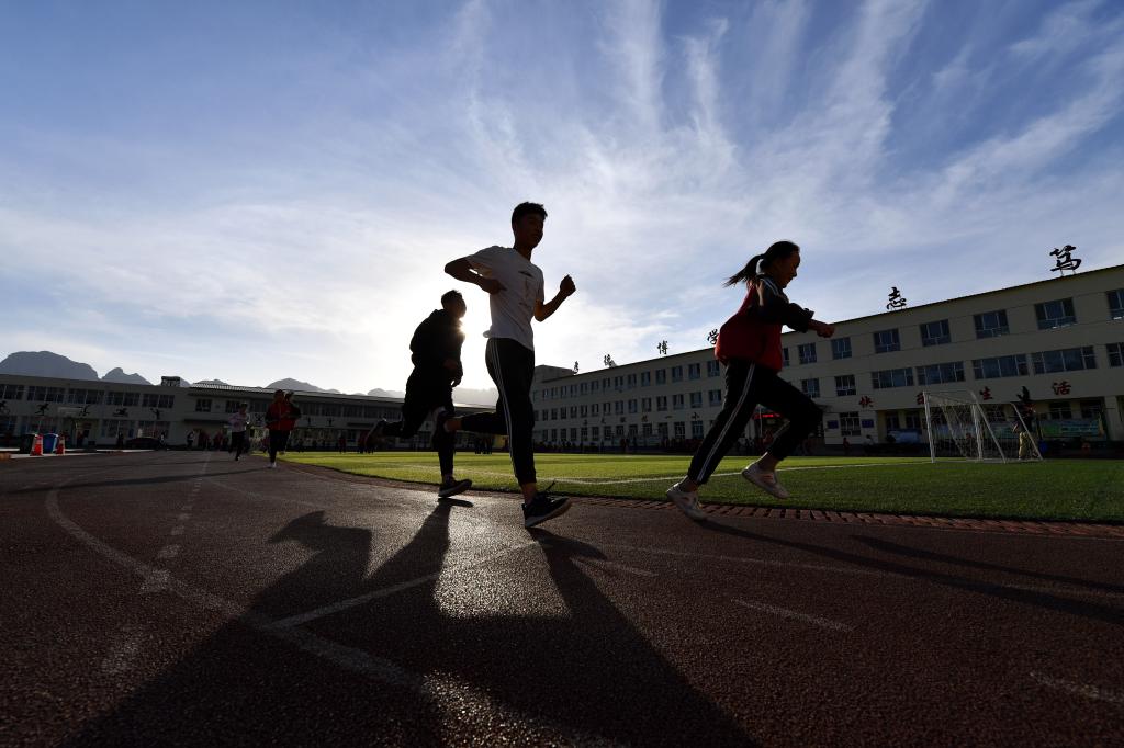 ↑這是學生們在跑步進行體能訓練(4月16日攝)。新華社記者詹彥攝