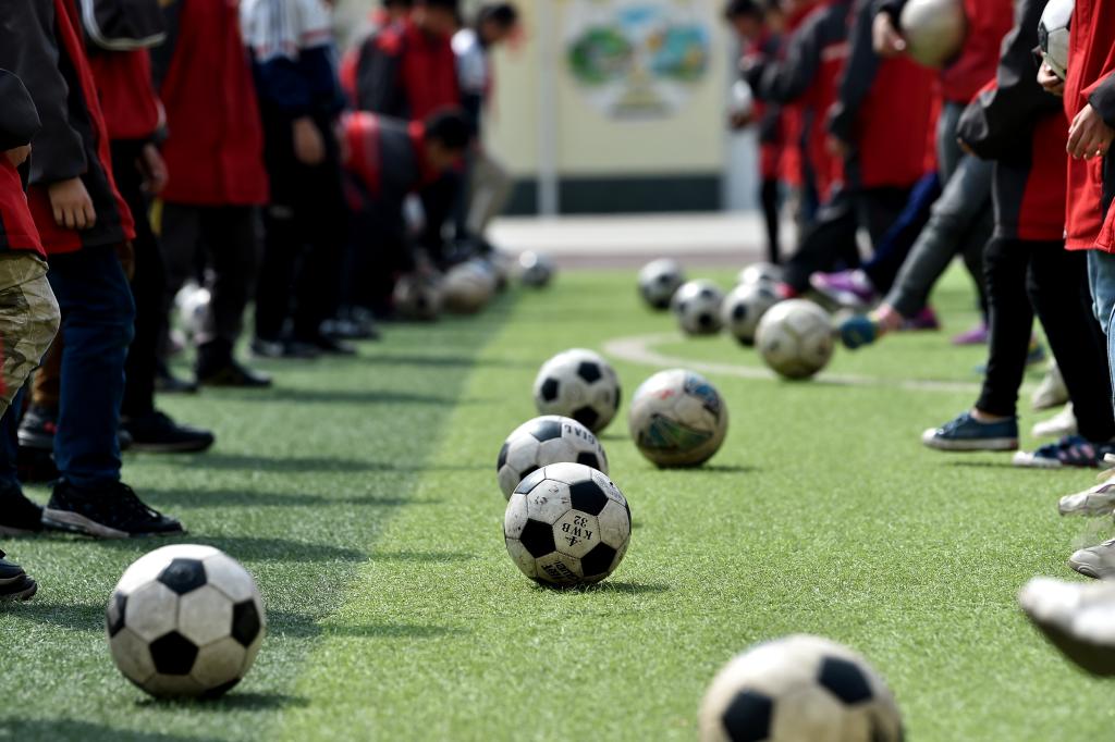 ↑這是學生們在練習傳球(4月18日攝)。新華社記者詹彥攝