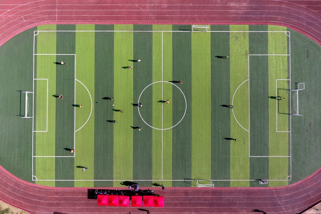 ↑這是初中組男子足球隊隊員們在進行分組對抗賽(4月17日無人機拍攝)。新華社記者詹彥攝