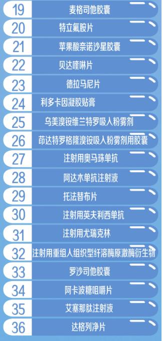 國家醫(yī)保局醫(yī)藥服務(wù)管理司司長熊先軍介紹,此次談判成功的藥品多為近年來新上市且具有較高臨床價值的藥品,涉及癌癥、罕見病、風(fēng)濕免疫、心腦血管、消化等10余個臨床治療領(lǐng)域。重點領(lǐng)域的5個基本藥物全部談判成功,22個抗癌藥、7個罕見病用藥、14個慢性病(含糖尿病、乙肝、風(fēng)濕性關(guān)節(jié)炎等)用藥、4個兒童用藥談判成功,進一步優(yōu)化了目錄結(jié)構(gòu)。