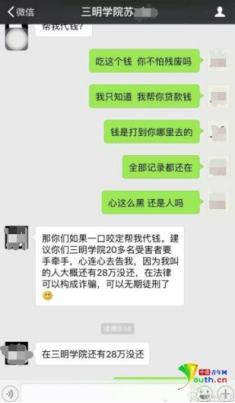 這中間有人催蘇某還款,被蘇某告知三明學院有20余人受騙,“大概還有28萬沒還”。