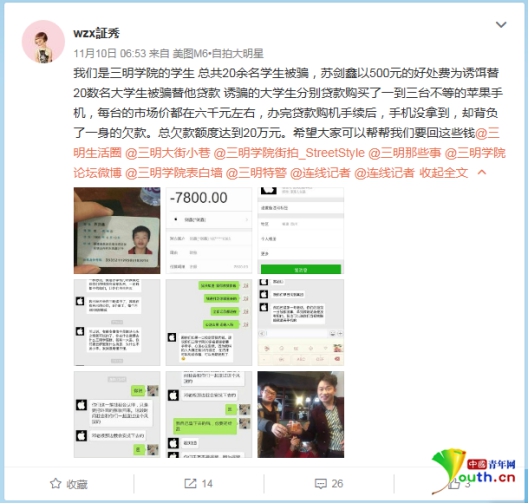 近日福建三明學院有學生發(fā)微博稱,自己與多名同學被誘騙貸款買手機,辦完貸款購機手續(xù)后,手機沒拿到卻背了一身債務。20名大學生總欠款額度達20多萬。