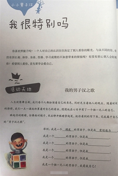 據(jù)上海教育出版社官方微信介紹,《小小男子漢》這本教材共分六個(gè)篇章。第一課“我是男孩”,主要幫助男生理解男孩和女孩究竟有哪些不同;第二課“擁抱我自己”,主要幫助男生理解什么樣的男孩算得上“酷”。第三課“好想長大”,理解“為什么男子漢要有擔(dān)待?”等。