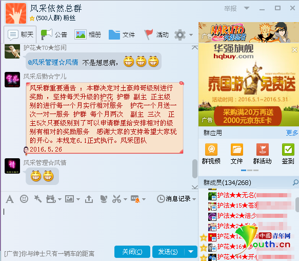 在“風(fēng)采依然總?cè)骸眱?nèi),中國青年網(wǎng)記者看到,成員共有268人。男性群成員被稱為“土豪帥哥”,按照貢獻(xiàn)大小分為情郎、護(hù)法、護(hù)花、護(hù)群、名譽(yù)副主、名譽(yù)正主、風(fēng)采親王7個(gè)等級(jí)。群主制定了一套升級(jí)規(guī)則,方式是在群內(nèi)發(fā)紅包,男性群成員只能搶自己發(fā)的紅包,搶錯(cuò)了必須發(fā)出來,否則會(huì)被移出群。女性群成員提供色情聊天服務(wù),可以搶所有的紅包。