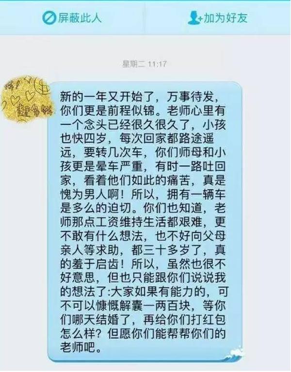 網(wǎng)帖中還上傳了數(shù)張疑似該老師與學(xué)生的QQ聊天截圖,其中的一張截圖中的對(duì)話道出了老師“眾籌”買車的原因:“新的一年又開始了,萬事待發(fā),你們更是前程似錦。老師心里有個(gè)念頭已經(jīng)很久了,小孩也快四歲了,每次回家都路途遙遠(yuǎn),要轉(zhuǎn)幾次車,你們師母和小孩更是暈車嚴(yán)重,有時(shí)一路吐回家,看看他們?nèi)绱送纯?,真是愧為男人啊!所以,擁有一輛車是多么的迫切。你們也知道老師那些工資維持生活都很艱難,更不敢有什么想法,也不好向父母親人求助,都三十多歲了,真的羞于啟齒!所以,雖然也很不好意思,但是也只能跟你們說說我的想法了:大家如果有能力的,可不可以慷慨解囊一兩百塊,等你們哪天結(jié)婚了,再給你們打紅包怎么樣?但愿你們能幫幫你們的老師吧?!?/p>