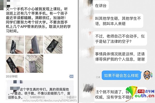據(jù)微博內(nèi)容顯示,德陽一中學(xué)老師發(fā)現(xiàn)學(xué)生上課玩手機(jī)后要求學(xué)生將手機(jī)砸壞,事后在朋友圈贊賞該同學(xué)“耿直”,這種做法也引來爭議。有人表示,砸手機(jī)能讓學(xué)生記住教訓(xùn),避免再犯。而有的學(xué)生則表示,直接砸手機(jī)這種做法太過簡單粗暴,也可以交給家長,畢竟手機(jī)價(jià)格也不低。