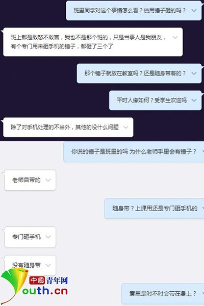 另一位目睹當(dāng)晚情況的同學(xué)向中國青年網(wǎng)記者反映,手機(jī)是被老師拿錘子砸的,該老師男性,其專門備有一個(gè)砸手機(jī)的錘子。雖然老師平時(shí)對(duì)學(xué)生們很嚴(yán)厲,但教學(xué)水平很不錯(cuò)。這次雖然學(xué)生有錯(cuò),但老師砸手機(jī)的處理方式有些欠妥。