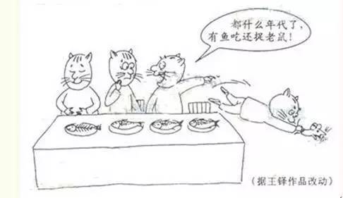 餐桌,許多貓吃魚(yú),就一只貓捉老鼠,別的貓說(shuō):“有魚(yú)吃還捉老鼠?”