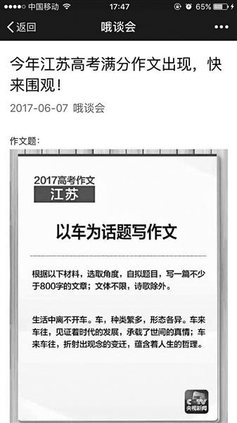 6月7日中午,全國高考語文考試科目結束,各地高考語文作文題目隨之在網(wǎng)絡上刷屏,據(jù)央視新聞微博消息,江蘇省的作文題目是“以車為話題寫作文”。