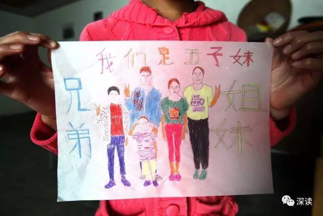 前段時間,衣伍木用畫筆給兄弟姐妹們畫了一張“全家?!?,這耗費(fèi)了她一天的時間。在畫里,五姐弟每個人都穿著彩色的服裝,她在畫的周圍也用彩筆寫著:兄弟姐妹,我們是五子妹(注:四川話,姊妹,表示家里的兄弟姐妹)。兩年前,在媒體記者給她們拍攝的眾多家庭合影中,五姐弟的表情都顯得有些無助和失落。但這次,在衣伍木的畫里,五姐弟都是開心的笑臉,手里還比著V。
