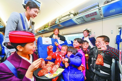 1月24日,在重慶開往福州的G1755次列車上,乘務員和“小候鳥”做游戲。春運期間,大批務工人員子女隨長輩踏上與父母團聚的旅途,南鐵福州客運段提前對重點線路乘務組進行兒童陪護培訓,在列車上準備了書本和玩具,用愛心護航“小候鳥”的團圓路。新華社記者 宋為偉攝