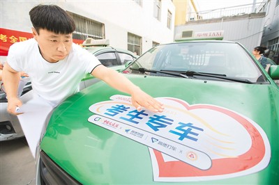 網(wǎng)絡(luò)出行平臺(tái)高德打車聯(lián)合有關(guān)方面推出“愛(ài)心送考 ”免費(fèi)服務(wù)。圖為參與提供服務(wù)的工作人員給車貼相關(guān)標(biāo)識(shí)。