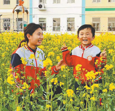 河北省大名縣黃金堤鄉(xiāng)金鄉(xiāng)水岸幼兒園老師給孩子講解油菜花。人民日報(bào)記者 張騰揚(yáng)攝
