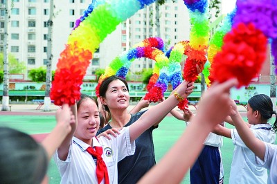 河北省邯鄲市邯山區(qū)農(nóng)林路小學(xué),老師和學(xué)生一起參加活動(dòng)。李昊攝/光明圖片