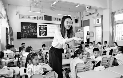 在廣東深圳市福田區(qū)南園小學,教師黃曉蕾在英語課上與孩子們互動。新華社發(fā)