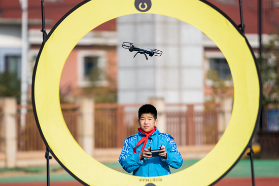 2021年12月14日,浙江省湖州市長興縣第一小學的學生操作無人機進行穿越訓練。 視覺中國供圖(資料圖片)