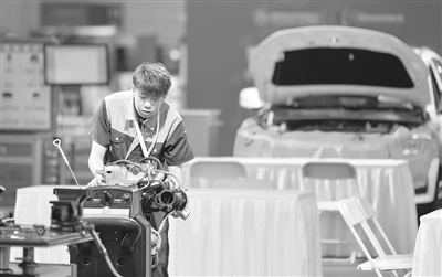 在天津舉行的首屆世界職業(yè)院校技能大賽上,參賽選手在進行發(fā)動機拆卸維護展演。新華社記者 孫凡越 攝